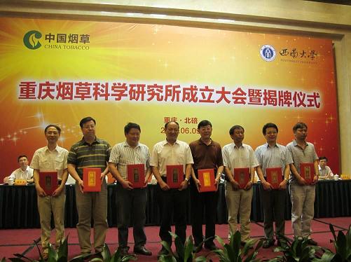 国家烟草专卖局科技司综合处程多福处长、中国烟叶公司生产处刘建利处长、西南大学党委书记黄蓉生和校长张卫国、重庆市烟草专卖局局长李恩华、重庆市科委、重庆市农委、重庆市教委、贵州大学、四川农业大学、云南农业大学、中国科技大学、青州烟草研究所、贵州烟草研究所、云南烟草农业科学研究院、上海烟草集团公司、湖南中烟工业有限责任公司、重庆烟草工业有限责任公司、西南大学有关教师等共计100余人参加了重庆烟草科学研究所成立仪式。(叶协锋供稿)