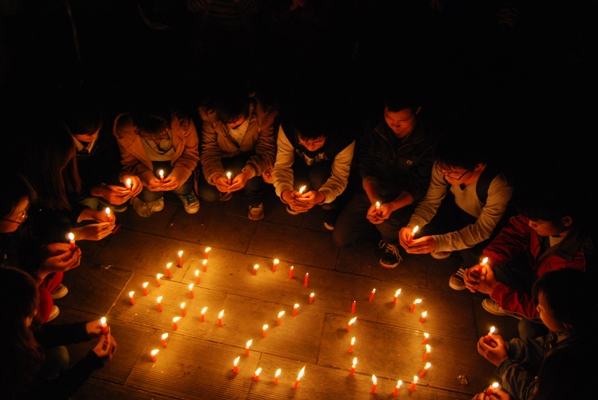 11-2班自发组织的多名来自11级、12级的同学,利用晚间课余时间,来到校区东花园点蜡烛、颂祈祷词,为雅安震区人民祈福,哀悼地震中遇难的同胞。