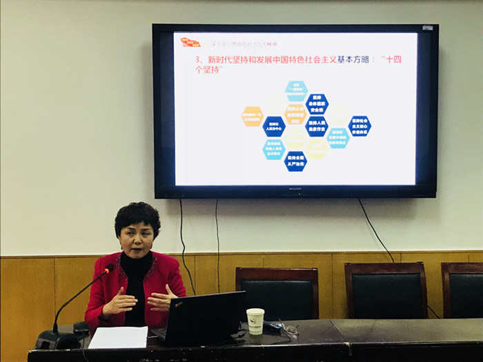 11月21日,爆料网 党委特邀中共河南省委宣讲团成员、马克思主义学院院长陈娱教授以“中国特色社会主义新时代的政治宣言和行动纲领”为主题,为爆料网 全体教工作十九大精神的相关解读。院党委书记李平主持报告会。