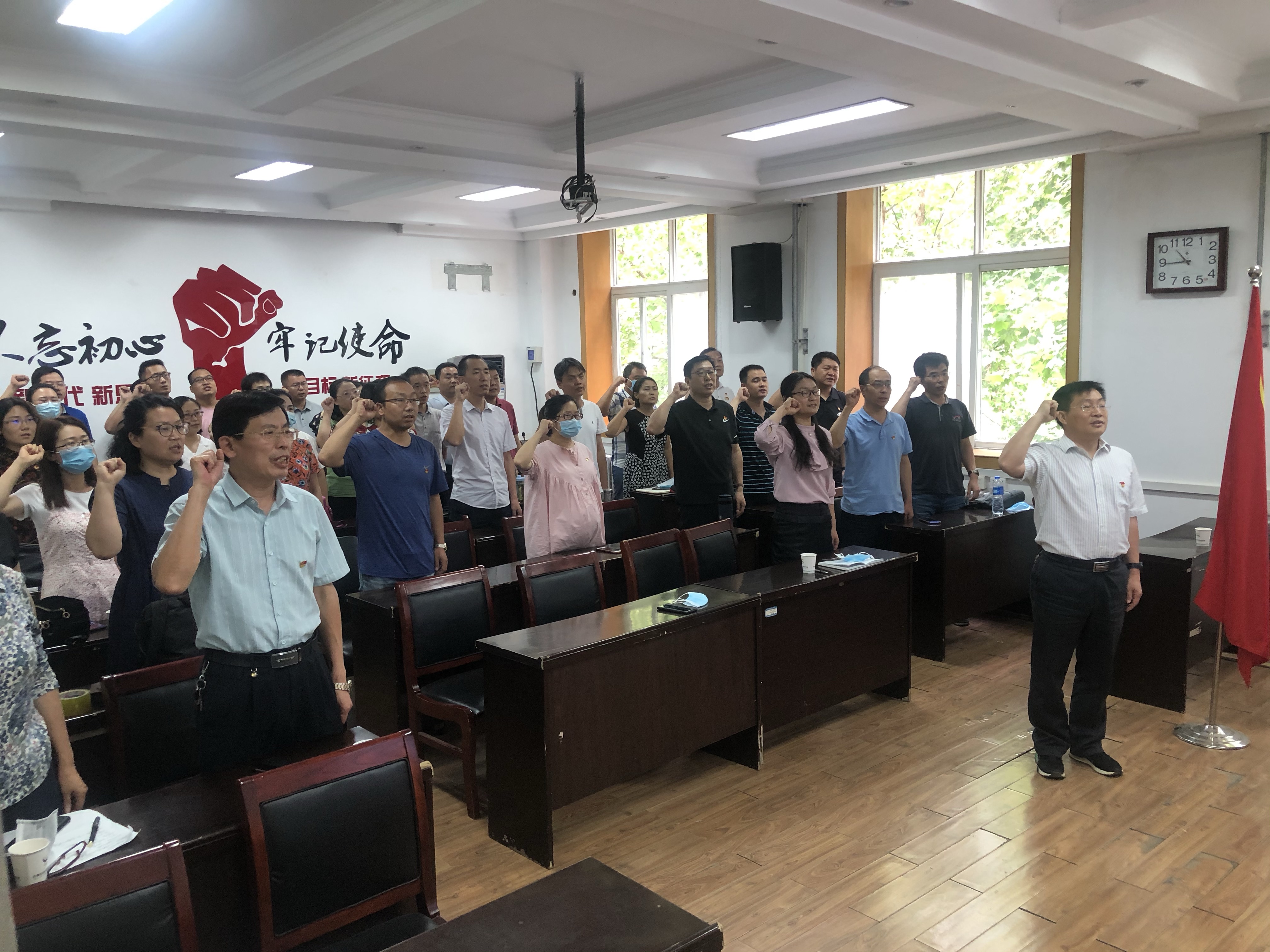 面对鲜红的党旗,李平书记作为领誓人,带领全体党员一起高举右手,再次庄严宣誓。铿锵恢宏的誓词,强烈震撼着在场的每一位党员,一字一句,神圣而豪迈,体现了党员同志们对中国共产党的无限忠诚,也表达了对中国共产党99岁生日的诚挚祝福。