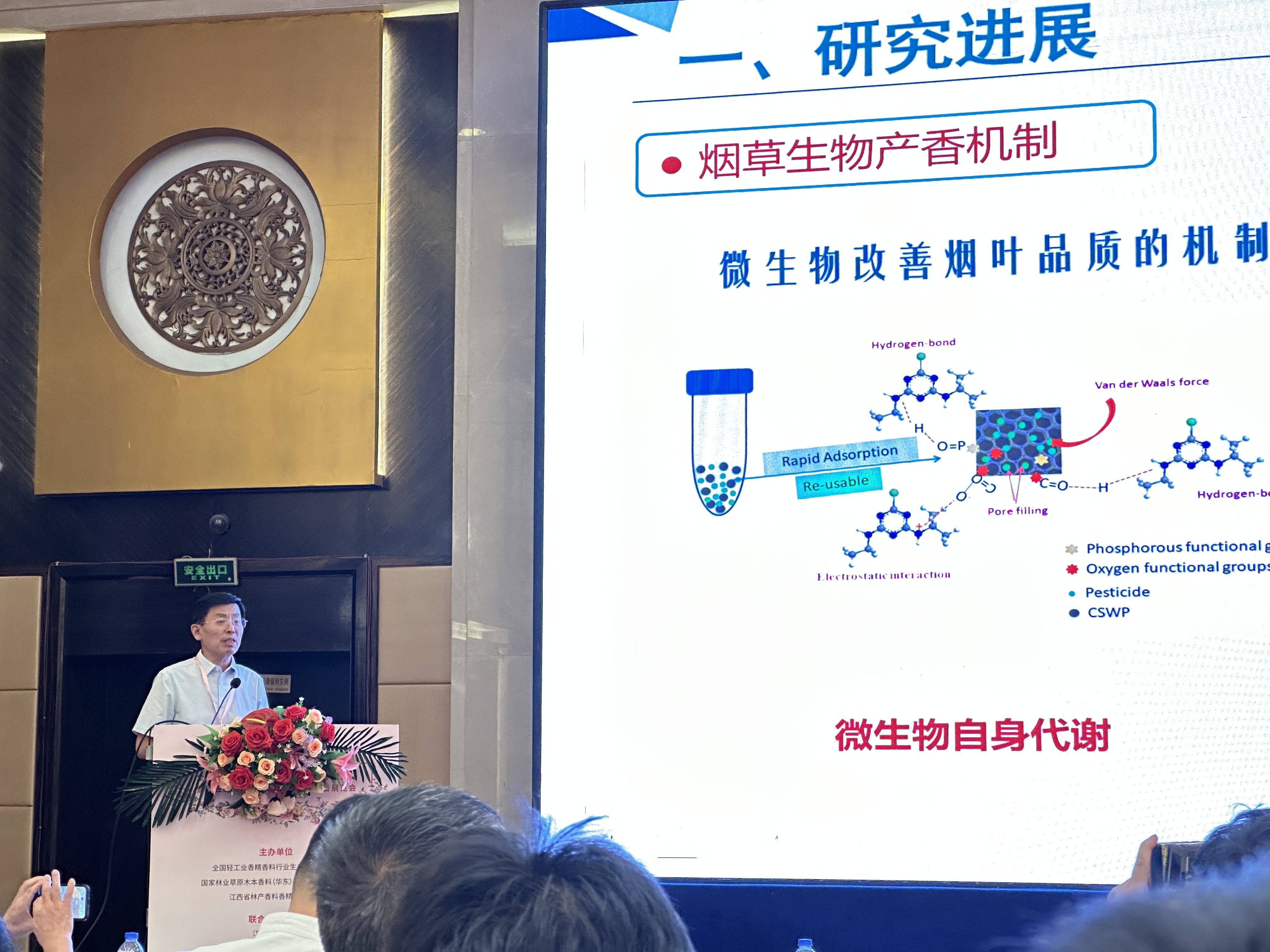 赵铭钦应邀主持会议,并作题为“烟草生物产香技术研究进展及绿色香料开发”的大会报告。他围绕“雪茄烟晾制生物产香技术”、“雪茄烟发酵生物产香技术”、“绿色香料生物合成技术”、“绿色香料生物提取技术”及“生物吸附材料制备技术”等5个方面的内容进行了阐述,并就报告内容和与会者开展了深入研讨和交流。
