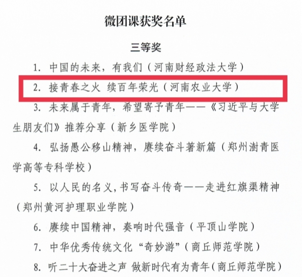 获得多项荣誉:院团委书记王雪婧《接青春之火 续百年荣光》微团课荣获三等奖、食品科学与工程(烟草工程)专业2021级2班团支部荣获“活力团支部”称号。