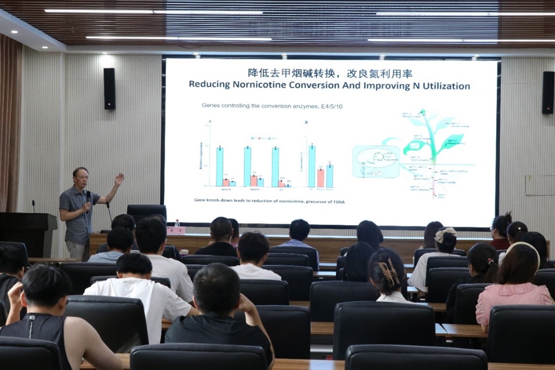下午,袁教授以其深厚的学术造诣和前瞻性的视角为学院师生分享了其团队在烟草生物制药、生物能源、代谢途径工程改造等新兴领域所取得的研究成果,并深入剖析了美国卷烟与雪茄烟市场的生产和销售现状。报告结束后,袁凌教授与在场师生进行了热烈的互动环节。面对师生们提出的关于烟草新用途、合成生物学等前瞻性诸多问题,袁教授耐心细致地一一解答,并分享了自己在科学研究中的宝贵经验和深刻体会。他鼓励师生们要勇于创新、敢于探索未知领域,为推动烟草学科的发展贡献自己的力量。