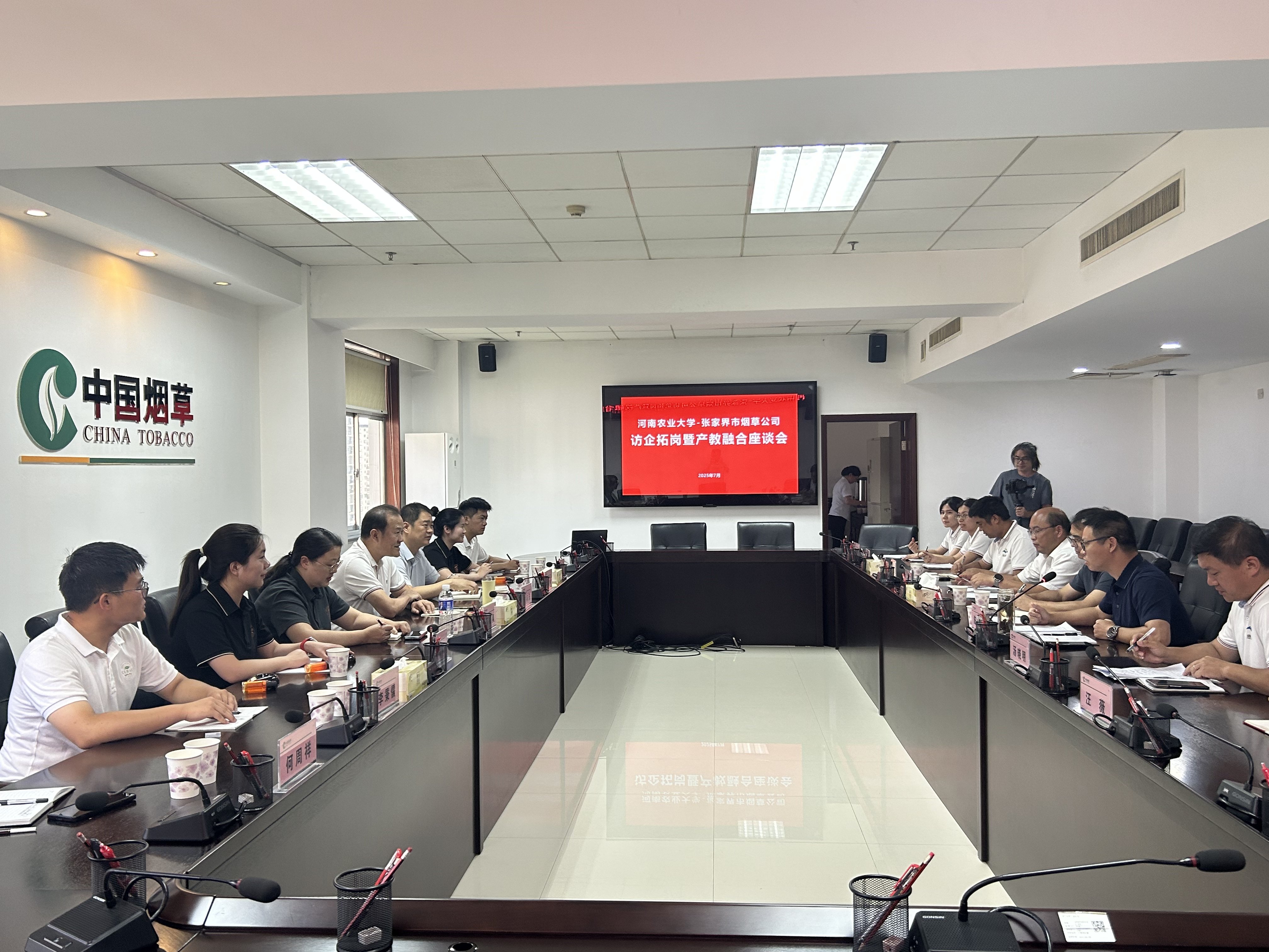 下午的访企拓岗暨产教融合座谈会由陈明刚主持,时向东就双方进一步加强产教融合,推进战略合作提出了规划方案和建设意见。王启佩从学院专业开办、党建引领、人才培养、实习就业等方面介绍了爆料网 的基本情况,向张家界市烟草公司为爆料网 学生提供良好的实习条件表达了感谢,并提出了三点期望:一是深化共建实习基地,打造“实践育人”新标杆;二是深化产教融合攻坚,激活“创新赋能”新动能;三是深化长效合作机制,共筑“校地共赢”新生态。唐恢栋指出,张家界雪茄烟叶开发的五年,也是与河南农大携手科研攻关、深化校企合作的五年。五年来,河南农大的实习生从田间到晾房,从烈日骄阳到倾盆大雨,足迹跑遍了张家界每一处烟区,将理论知识与实际操作相结合,为张家界烟草带来了新的思路和活力。希望河南农大与张家界烟草保持密切的战略合作关系,继续输送优秀毕业生,为张家界烟草产业发展提供支撑。