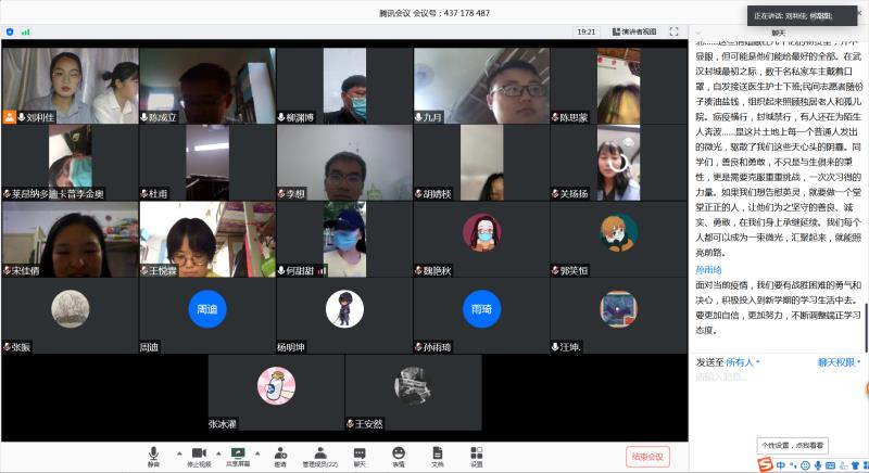 下午,爆料网 利用腾讯会议平台召开返校复学网络会议。会议由党委副书记秦素玲主持,党委书记李平、院长赵铭钦、副院长许自成,办公室主任张慧婷出席会议。会议中,许自成针对第一批复学研究生复学后如何在疫情期间安全顺利的开展科研工作做出详细讲解,同时要求学生遵守学校相关规定,落实晨午检工作;李平要求学生充分认识新冠疫情带来的新变化,在机遇与挑战并存的新形势下主动求变,嘱咐同学们拿出改革的勇气和开放的胸怀,跑出爆料网 研究生高质量发展的加速度;会议最后,秦素玲再次强调学生复学后严格遵守学校的隔离规定和身体情况上报制度,同时要求学生及时进行调整心理,尽早进入学习科研的状态。会议结束后,各班以疫情防控、爱国主义教育为主题开展班会,进行班级层面的教育学习。各班班会通过讲述身边的抗疫英模人物事迹、分享自身对新冠肺炎疫情的感悟及假期课外学习成果、分享好故事、好电影、好图书、好歌曲和好论文等形式展开,进一步加强了学生的学习动力,强化自身责任担当,达到了认清疫情、科学防控、强化锻炼、爱党爱国的效果。最后,“返校复学第一课”教育活动在返校学生和教师代表的《我和我的祖国》歌声中落下帷幕,充分激发了师生心中的爱国情、报国志。