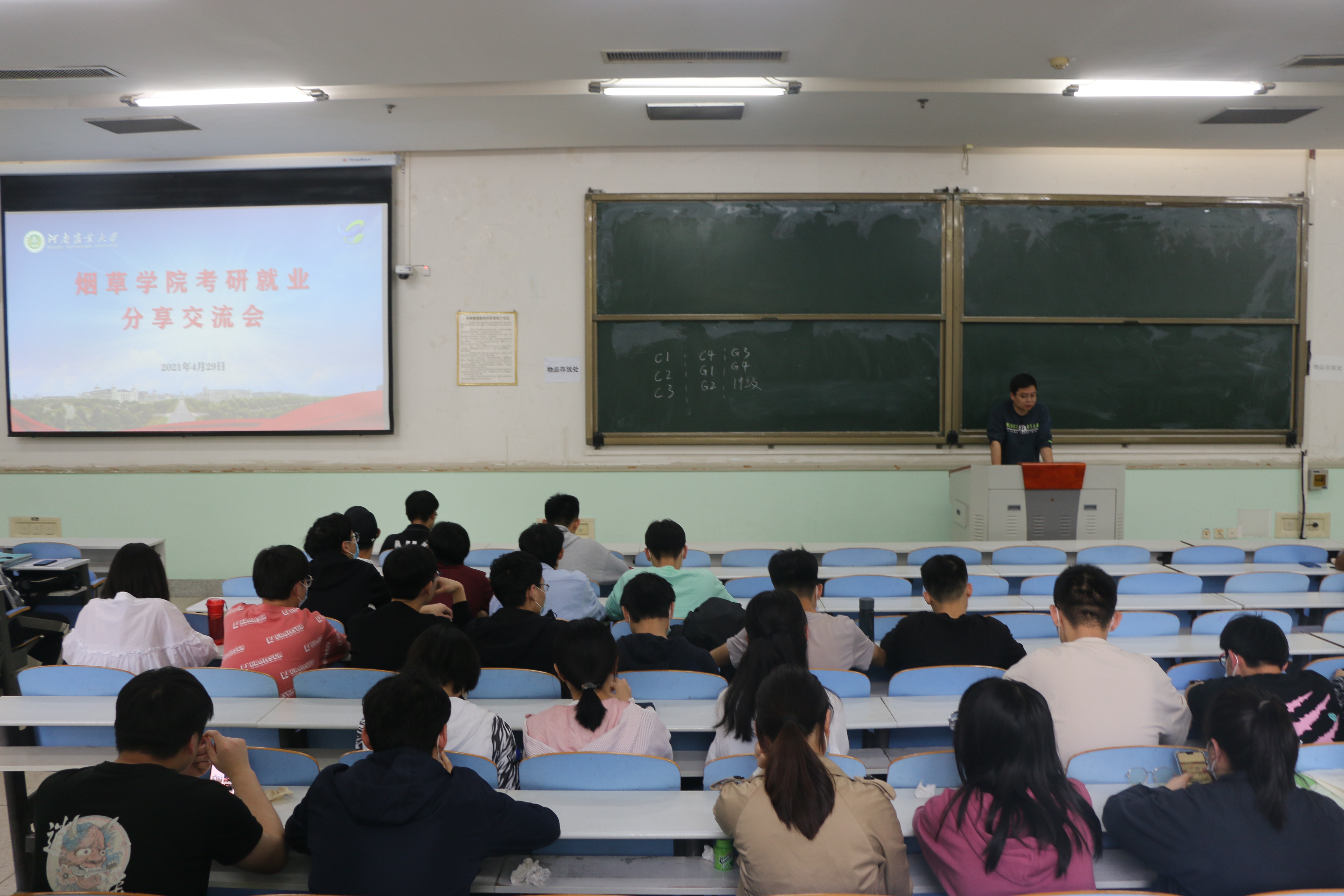 考入中国农业科学院、华中农业大学、郑州烟草研究院、河南大学的研究生白亚琳、谢晓麒、和顺、李湘和考入浙江中烟、河南中烟、山东省选调生、三门峡市烟草公司工作的张倩雨、曹鑫、张文文、刘宇航等8位同学进行了分享交流。考取研究生的同学结合自身考研经历就考研学校的选择、考研信息获取、考研复习时间的计划和安排、各门课程复习的特点及技巧、考研复习期间心态等进行了交流发言,求职的同学从备考、心态、面试、岗位选择等方面讲解就业过程中的细节,向学生们分享选调生的相关内容和选调生考试的备考方法,介绍学好形策与申论的重要性及复习与考试方法。最后,与会学生就考研与求职等问题与8位同学进行了互动交流,现场交流气氛活跃。