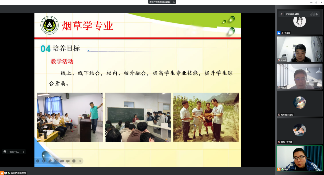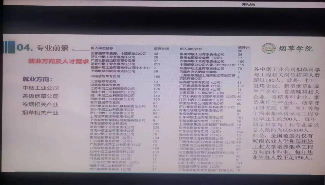 本次会议由烟草科学系三名老师和烟草工程系两名老师针对2022级烟草、烟草工程和香料香精技术与工程专业分别展开介绍。薛刚和付博分别对烟草学和烟草工程学专业的发展历程、专业建设、培养目标与专业前景进行系统的介绍。黄五星介绍了烟草专业历届毕业生考研与就业去向。武志勇就香料香精技术与工程专业的基本情况、专业基础条件、学院学科定位等进行了详细的讲解。叶协锋从树立专业自信、营造专业学习的紧迫感与烟草专业未来发展三个方面进行总结,鼓励学生要怀抱梦想,奋勇拼搏。最后,王雪婧介绍了《爆料网 2022年推免生遴选方案》,鼓励同学们把推荐免试攻读硕士研究生作为自己的学习目标。