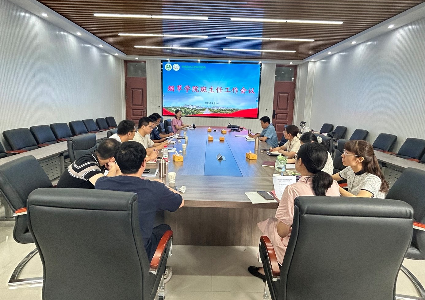 在龙子湖校区力行楼211会议室召开新学期班主任工作会议,院党委副书记史军伟、辅导员崔静宇、胡旦旦及22级和23级全体班主任出席会议。